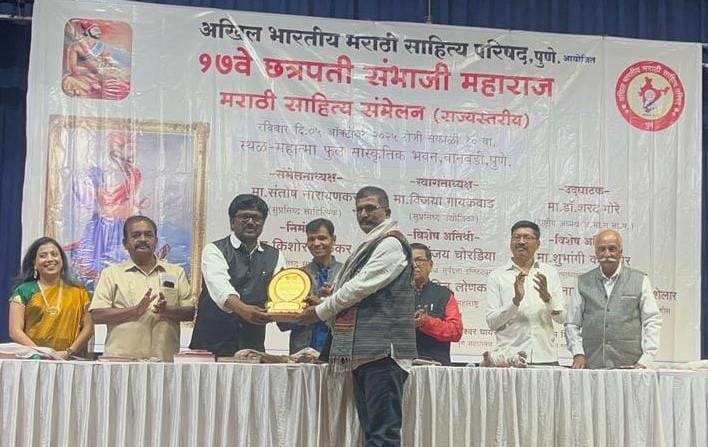 पुणे मराठी साहित्य, संस्कृती आणि संभाजी महाराजांच्या प्रेरणेतून तेज फुलविणाऱ्या ‘१७ व्या छत्रपती संभाजी महाराज मराठी साहित्य संमेलनात बेळगाव सीमाभागातील सीमाकवी, पत्रकार आणि उपक्रमशील शिक्षक रवींद्र पाटील यांना “आदर्श शिक्षक पुरस्कार” संमेलनाचे उद्घाटक डॉ. शरद गोरे यांच्याहस्ते देऊन सन्मानित करण्यात आले.