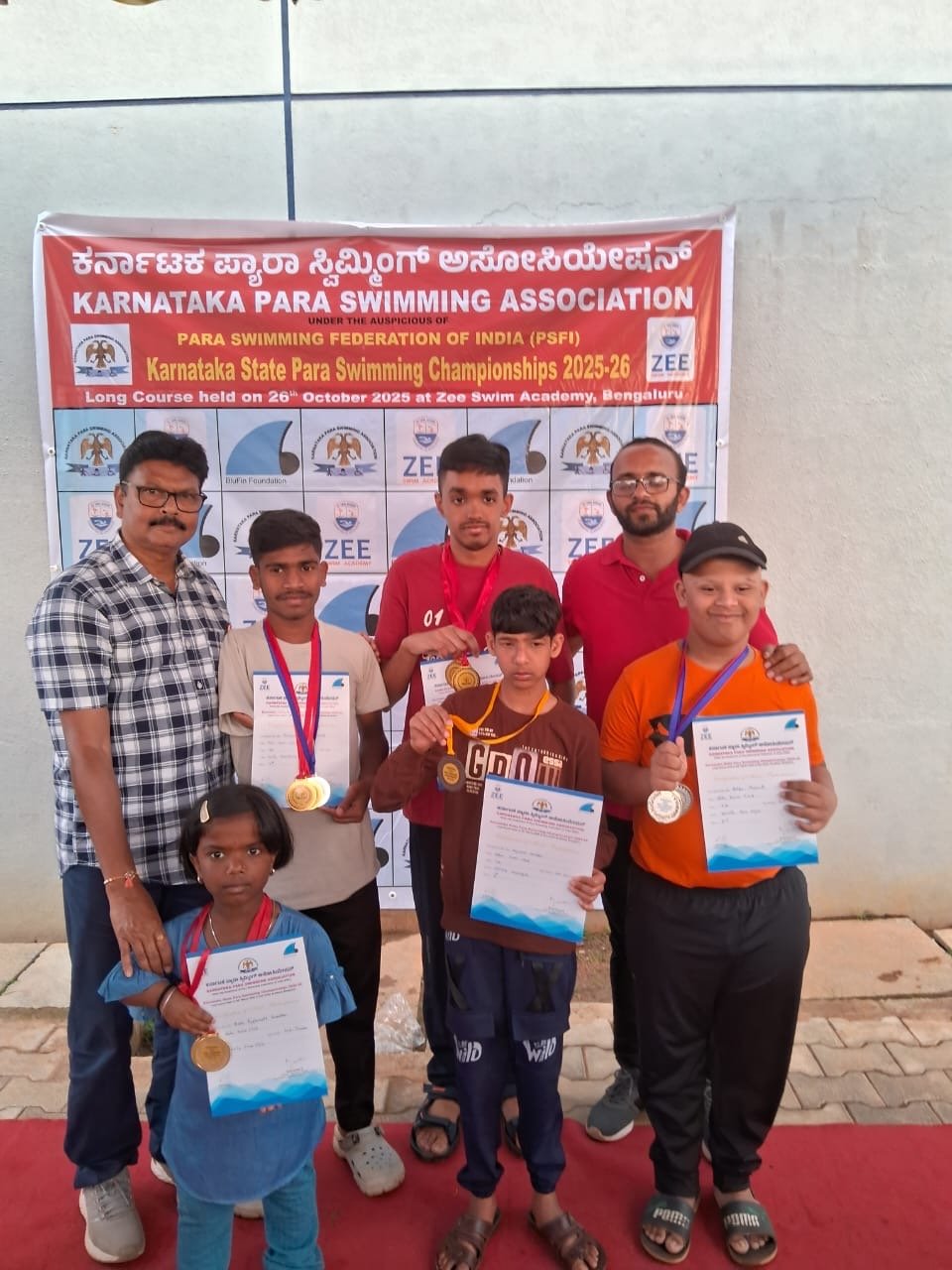 राज्य पातळीवरील फिजिकली चॅलेंज प्यारा जलतरण स्पर्धेत ओम, आरोही, संचिता, शुभम, विशाल, मयांक, यांना सुवर्णपदके